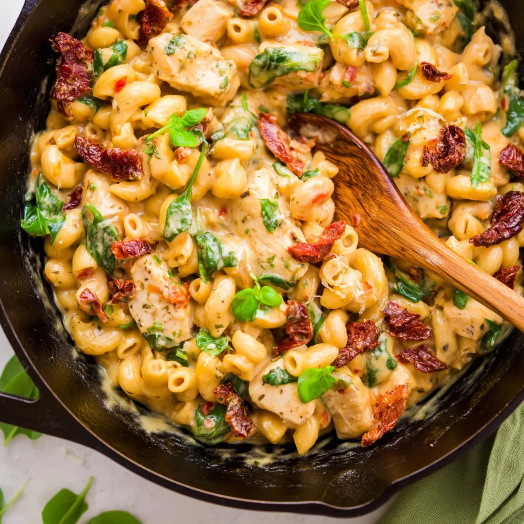 This recipe also brings in Italian-style flavor without making things complicated. The mozzarella and cheddar create the creamy base, while the sun-dried tomatoes, garlic powder, and Italian seasoning give the sauce more depth. Add tender chicken and spinach, and you have a skillet dinner that feels complete all on its own.