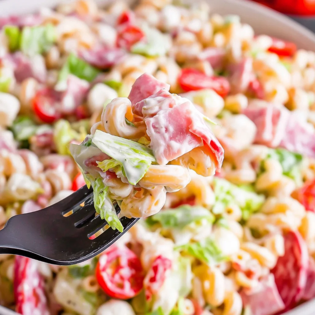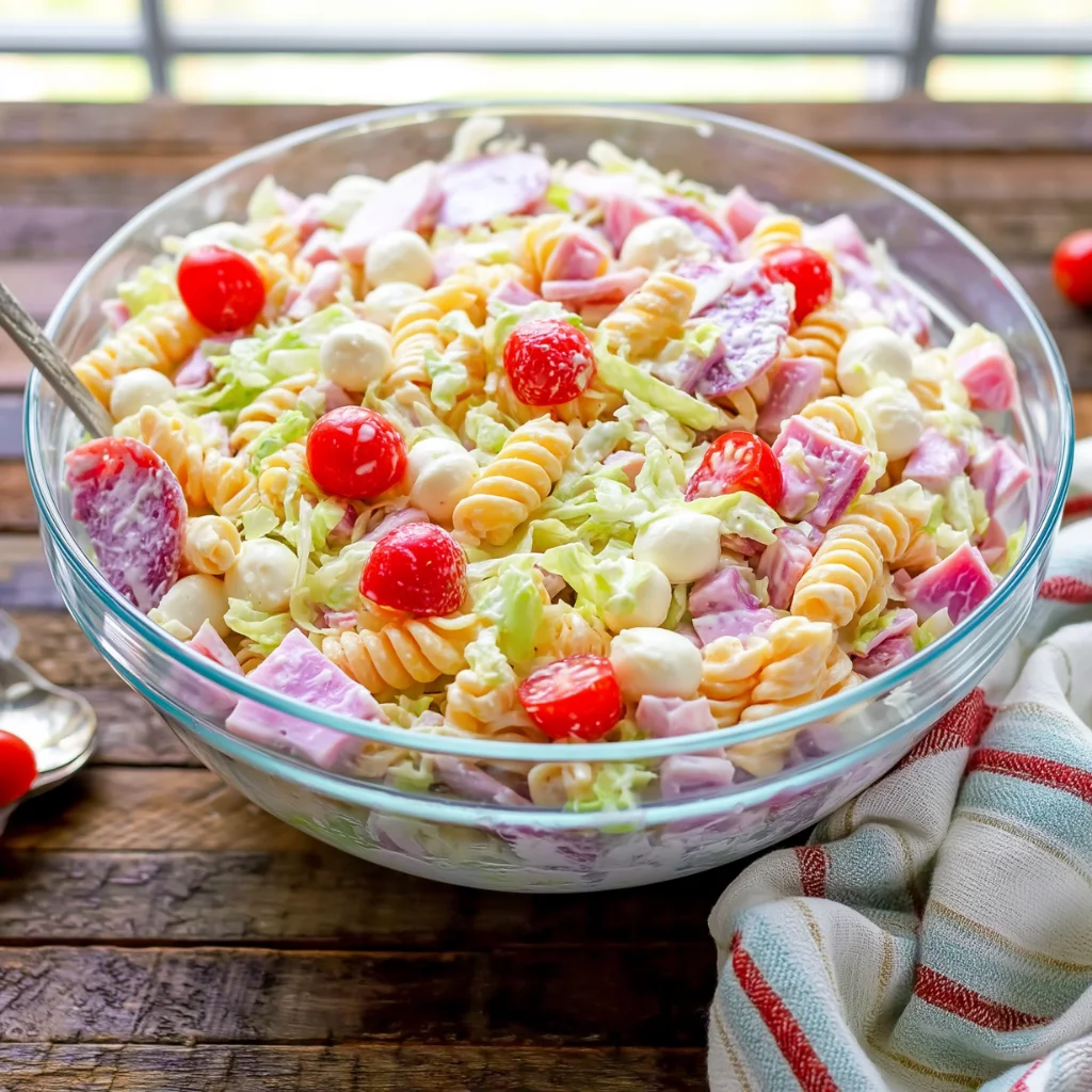 Some pasta salads are clearly side dishes. This one can hold its own as lunch or a light dinner. Between the rotini, mozzarella, salami, ham, and pepperoni, there is plenty of substance here. The tomatoes, peppers, onion, and lettuce keep it from feeling too rich, so the whole bowl stays balanced instead of tipping into “too much.”